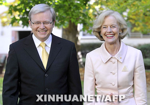 4月13日,在澳大利亞首都堪培拉,澳大利亞總理陸克文(左)與昆士蘭州州督昆廷·布賴斯參加新聞發(fā)布會(huì)。當(dāng)天,澳大利亞總理陸克文宣布昆廷·布賴斯為下任澳大利亞總督。她將成為澳大利亞首位女總督。 新華社/法新