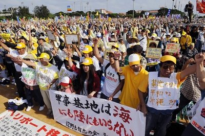 據(jù)日本“共同社”網(wǎng)站報(bào)道,反對美軍普天間機(jī)場縣內(nèi)搬遷、向日美雙方政府要求將機(jī)場遷至沖繩縣外或國外的沖繩縣民集會25日下午在該縣讀谷村舉行。主辦者稱約有9萬人參加了集會。這是各黨派首次就普天間問題舉辦集會活動。沖繩縣知事仲井真弘多在發(fā)言中表示“希望政府能出示負(fù)責(zé)任的解決方案,遵守眾院選舉時(shí)的承諾”,要求改善基地負(fù)擔(dān)集中于沖繩的現(xiàn)狀。