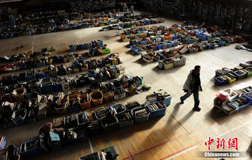 4月18日下午,一名日本人經過設在宮城縣名取市一所小學校體育館里的受災物品匯總處,這里匯集了附近搜尋到的影集、畢業證書、書包等物品,供災民前來尋找。 中新社發 侯宇 攝
