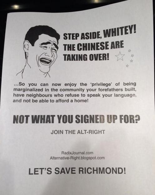 報道稱,大溫哥華地區列治文市(一個擁有大量華裔人口的城市)的一些居民在他們的郵箱里面發現了一些傳單,該傳單上鼓動白人加入一個名為"Alt-Right"的運動,號召白人“一起對抗華人群體,拯救被華人搶占的列治文市”。