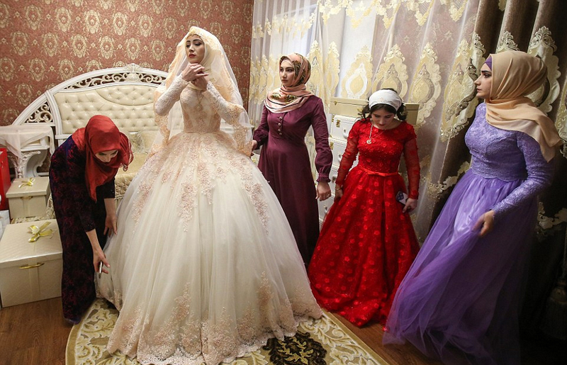 在整個婚禮過程中,新娘都需要站在指定位置,不能參加慶祝活動,甚至不可以隨意說話或移動。在被介紹給新郎家屬的過程中,新娘需要保持謙卑,并為出席的客人奉上一杯水。而新郎通常不會在婚禮中露面,只有在儀式結束客人離開后,新郎新娘才能夠見面。在婚禮的第三天,伊斯蘭教士毛拉會在新郎家中主持傳統的車臣婚禮儀式。儀式上,新娘的叔叔會為新娘帶上戒指,而新郎會去注冊處登記。