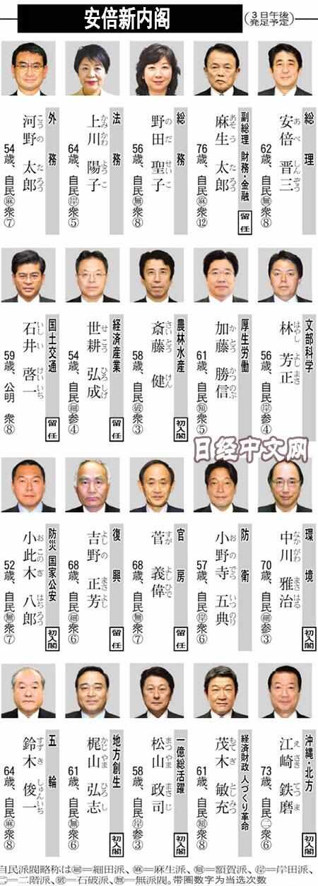 圖為日本經濟新聞制作的安倍新內閣成員名單一覽