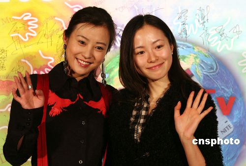 十二月四日,大陸知名演員郝蕾(左)、江一燕在臺(tái)北參加“二00七臺(tái)灣國際影視創(chuàng)投會(huì)”開幕式,成為媒體競相拍照的焦點(diǎn)。 中新社發(fā) 董會(huì)峰 攝