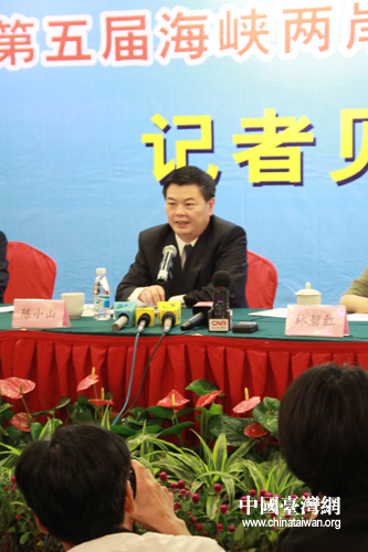 中共梅州市委副書記陳小川介紹論壇情況并回答記者提問。(中國臺灣網 馮江 攝)