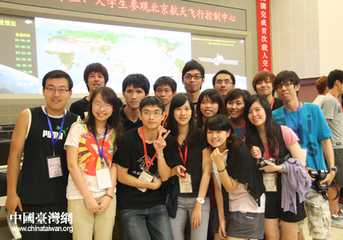 學生們在北京航天飛行控制中心參觀合影留念。(中國臺灣網(wǎng) 李瑞艷 攝)