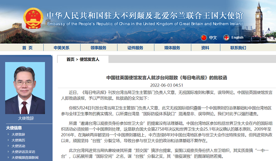中國臺灣網6月3日訊 近日,英國《每日電訊報》刊發臺灣當局衛生主管部門負責人文章,無視國際準則和事實,誤導輿論。我駐英國使館發言人即致函該報,予以嚴厲批駁。