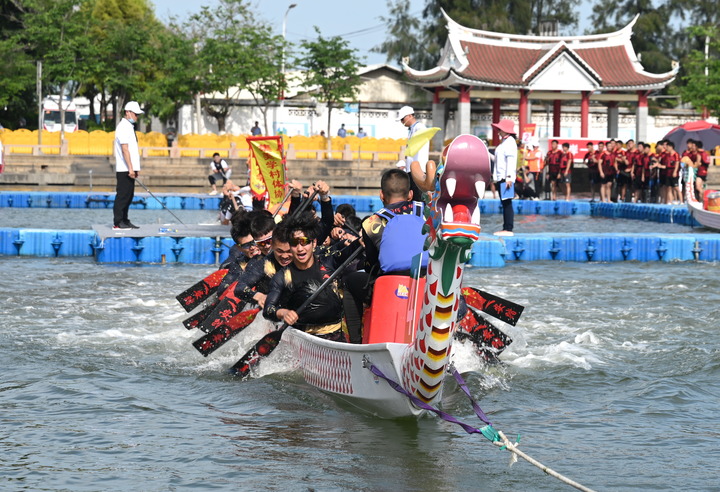 6月2日,“海芋·臺胞社工隊”在“龍騰虎躍”2022海峽兩岸龍舟賽300米直道賽的預賽中沖過終點。新華社記者林善傳攝