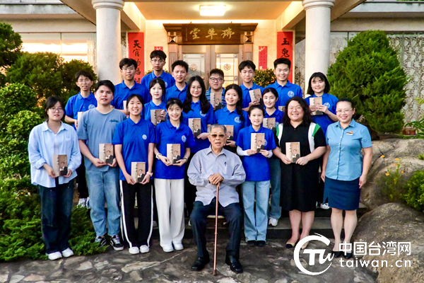 圖為漳州天福茶業有限公司創始人李瑞河先生為實踐隊成員贈書并合影留念。(中國臺灣網發)