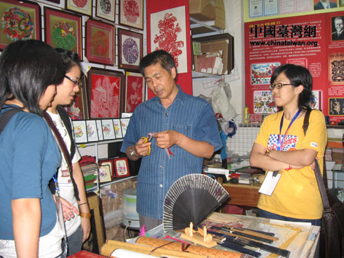 在剪紙坊,許多臺灣的女學生對這門細致而精巧的藝術贊嘆不已,拿起工作間展出的剪紙作品左看右看,愛不釋手。最后,幾個學生還要求師傅現場為她們剪了一對鳳凰。師傅一邊細心講解,一邊用剪如飛,臺灣學生看的“心驚肉跳”,連忙請師傅專心剪紙。師傅笑著說:放心吧,沒問題。說話間,一對栩栩如生展翅欲飛的鳳凰完好地展現在自己面前,令臺灣學生嘖嘖稱奇,趕緊拍照留念,并購買收藏。(立霞 小輝)