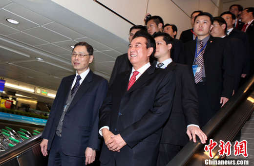 2月23日中午,應臺灣;鶗麻L江丙坤之邀,海協會會長陳云林率海協會經貿考察團搭機抵臺。圖為陳云林(前右)一行在;鶗倍麻L高孔廉陪同下,乘滾動扶梯進入桃園機場一樓入境大廳。中新社記者 董會峰 攝