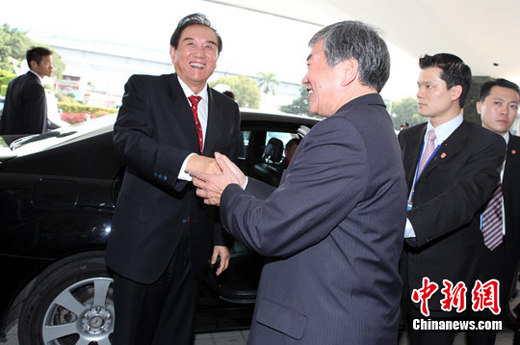 2月24日,海協會會長陳云林跨越濁水溪進行在臺灣中南部的經貿考察之旅,他形容首次到高雄,心情很激動。圖為當天下午,陳云林乘車來到楠梓出口加工區參觀,受到熱情歡迎。中新社記者 董會峰 攝