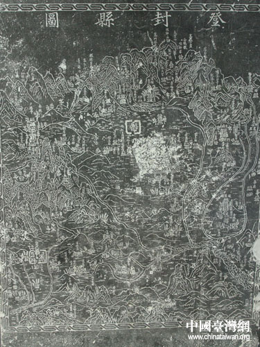 嵩陽書院明代石刻“登封縣地圖”,刻于萬歷癸巳年(公元1593年),圖上詳細刻制著嵩山地區名勝古跡的分布情況和山川、河流、道路、村鎮等名稱,是登封文物分布圖,又是登封縣地圖。登封縣文物名勝盡管志書都有記載,但用地圖形式直接描述的,僅此一塊登縣石刻地圖。(中國臺灣網 徐維彬 攝)