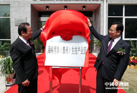 9月19日,在江蘇省泰州市“中國醫(yī)藥城”內,臺灣工業(yè)總會理事長陳武雄(左)同泰州市委書記張雷共同為“海峽兩岸(泰州)生技產(chǎn)業(yè)園”開園揭牌。(中國臺灣網(wǎng) 鐘寶華 攝)