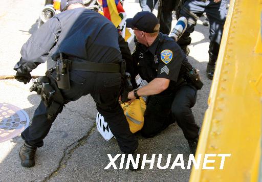 當(dāng)?shù)貢r(shí)間4月9日,北京時(shí)間4月10日,奧運(yùn)火炬在美國舊金山傳遞時(shí),一名企圖搶奪火炬的“藏獨(dú)”分子被當(dāng)?shù)鼐飚?dāng)場(chǎng)制服。新華社記者李穎攝