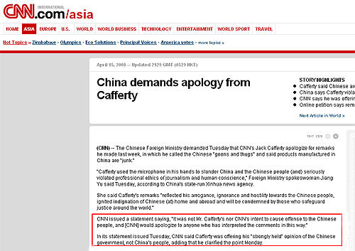 CNN在不久前關(guān)于西藏事件的報(bào)道,就曾惡意剪裁圖片,并“誤稱”西藏為“國家”,顯示其所謂的新聞自由在偏見主宰下,常常干出渲染夸張﹑移花接木﹑斷章取意﹑指鹿為馬的奇事。而此番卡弗蒂于奧運(yùn)火炬在歐美數(shù)國遭遇阻撓的敏感時(shí)刻,大開罵戒,則亮出了他勢與中國和中國人過不去的架式與底牌,更喪失了一個(gè)媒體人的公正與風(fēng)度。難怪中國網(wǎng)民已經(jīng)流傳“做人不要太CNN。”