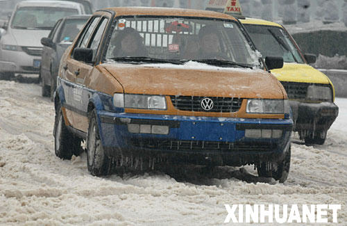 在大雪中行駛的汽車(1月28日攝)。當日,長沙再次遭受大雪襲擊,市區交通嚴重受阻。據悉,1月12日以來,湖南省大部分地區出現了長達10余天的雨雪、低溫冷凍天氣,氣溫之低,持續時間之長是近50年以來最嚴重的。 新華社記者 龍弘濤 攝