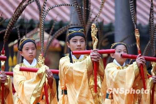 9月28日清晨,臺(tái)北孔廟隆重舉行祭孔大典,紀(jì)念孔子誕辰2559周年。活動(dòng)遵循傳統(tǒng)古禮儀節(jié),分37步驟。圖為多年來?yè)?dān)任佾生的臺(tái)北大龍小學(xué)生,以六佾舞行獻(xiàn)禮,展現(xiàn)“誠(chéng)于中,形于外”的姿儀,表達(dá)對(duì)孔子的尊崇與贊頌。
