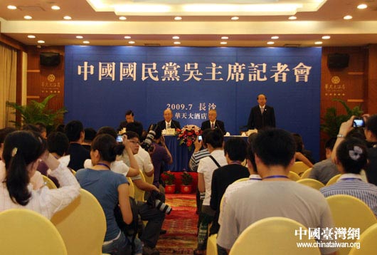 為期兩天的第五屆兩岸經貿文化論壇今日下午在長沙落下帷幕,閉幕式結束后中國國民黨舉辦記者會,黨主席吳伯雄介紹參加此次論壇的情況,并回答記者提問。(中國臺灣網 鐘寶華 攝)