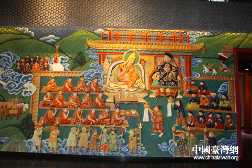 進門之后,映入眼簾的是一幅大型浮雕壁畫,描述了五世達賴喇嘛赴京覲見順治皇帝的場景。(中國臺灣網 李典典攝)