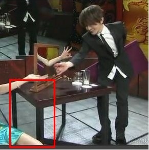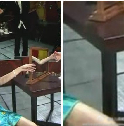 ohdarlin:這很簡單。桌子下面其實(shí)有個(gè)鏡子,就是說實(shí)際上只有一半位置是空間,另一半是個(gè)三角形的箱子,里面藏了人。你們注意看劉謙一開始做的那個(gè)位置桌子下面的顏色怪怪的。